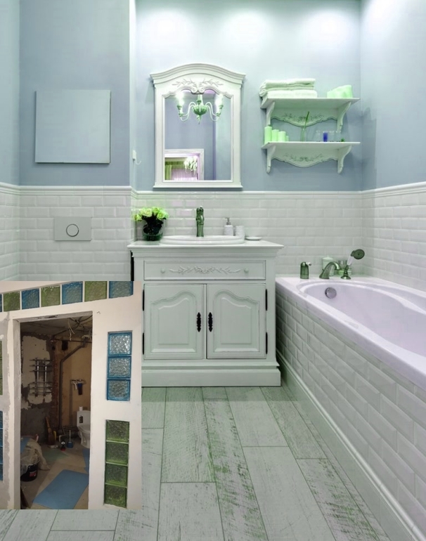 Может вам к дизайнеру обратиться, только в ванну заказать проект, вряд ли это прям дорого. Зато дизайнер впишет вам эти стеклоблоки в экостиль, сложная задача, я бы не смогла сама её решить. Или сносить эту стену и делать как вам нравится.