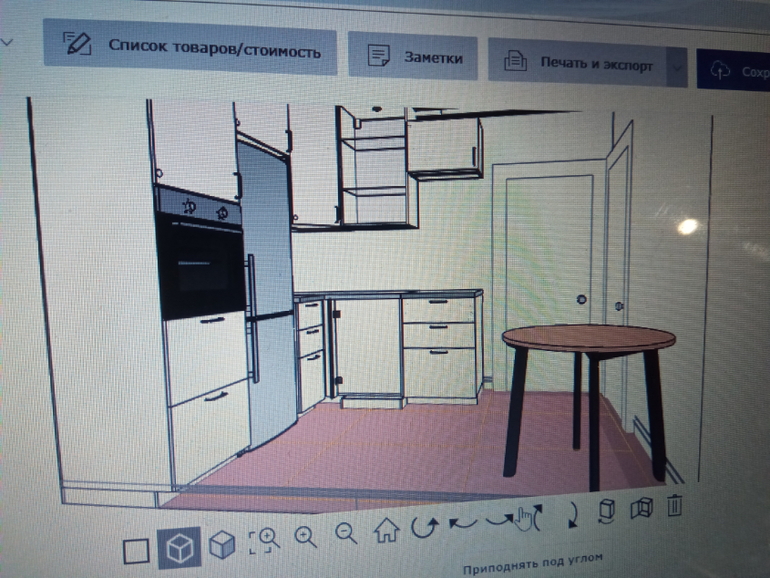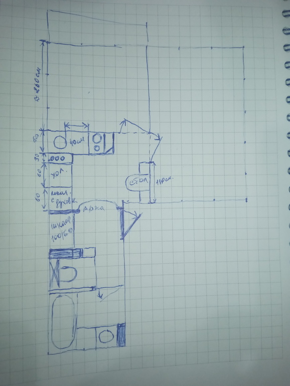 Так будет: в кухне с левой стороны по порядку: пенал высокий с духовкой на уровне 60-80 см от пола, далее холодильник, далее скрыть в шкафу трубы(они примерно 30/60 занимают) далее угловой стол под мойку, мойка в углу, далее узкий модуль под узкую варочную панель и последний узенький модуль скошенный для завершенного вида.