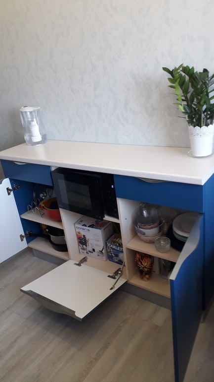 Долго не могли пристроить холодильник, везде он мешал, и вот теперь он стоит в уголке незаметный и это точно его место! Посудомойка тоже не оставляла шансы на ящики под посуду, комод решил все проблемы. Все теперь вмещается!
