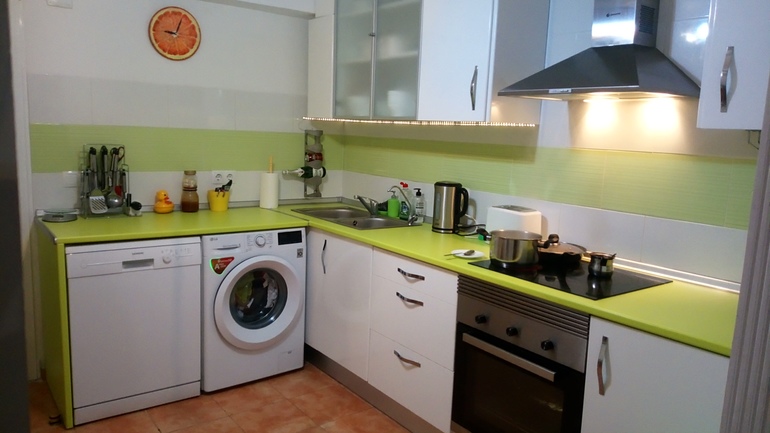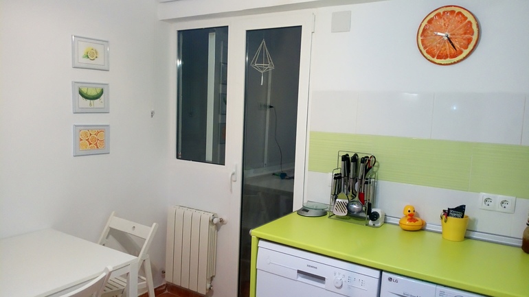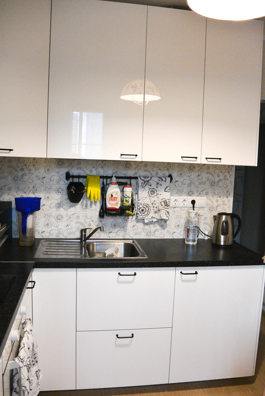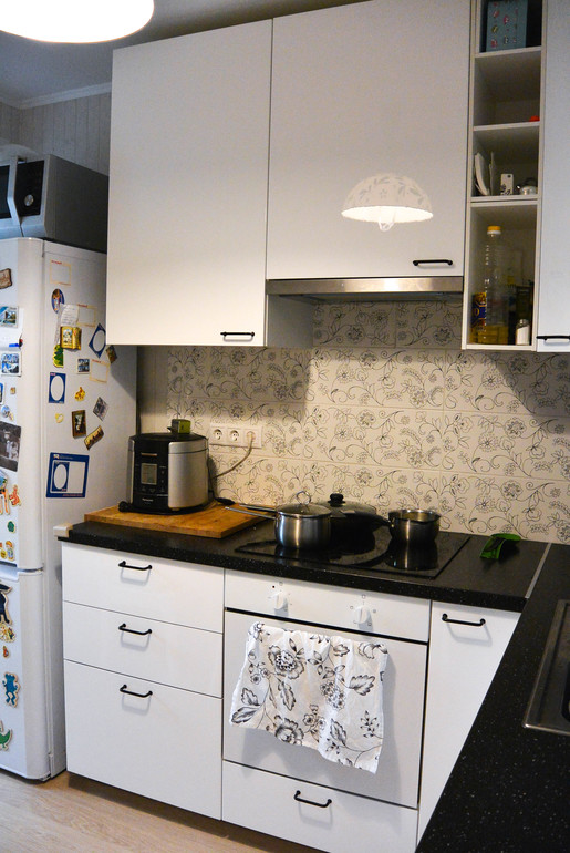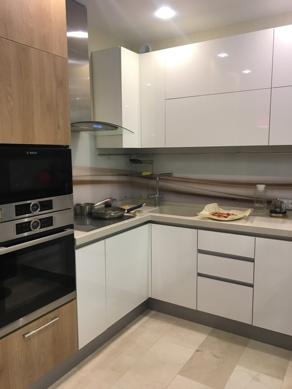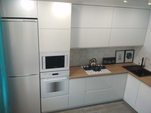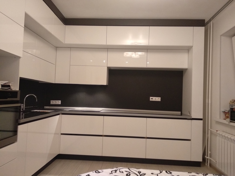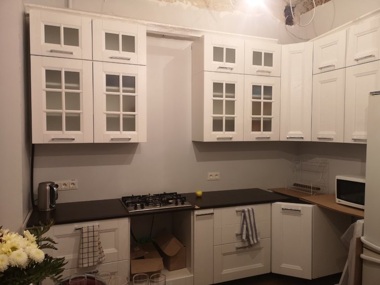 это фото сразу после установки, после уже установили дополнительную подсветку и повесили шторы, стало намного уютнее. Кухня на самом деле чисто белая.