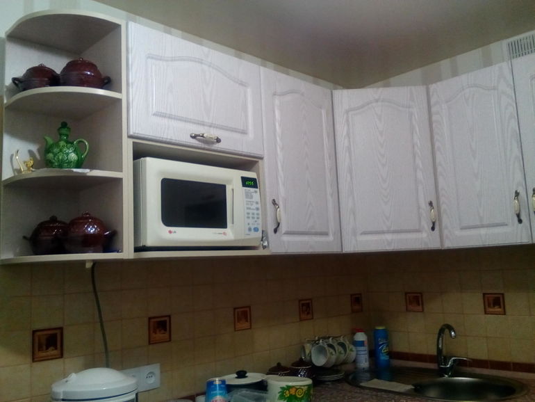 Обдумываю расположение микроволновки и не могу определиться. Сейчас у нас располагается в верхнем шкафу. Мне не совсем удобно вынимать тарелку разогретого супа, муж высокий как бы нормально.