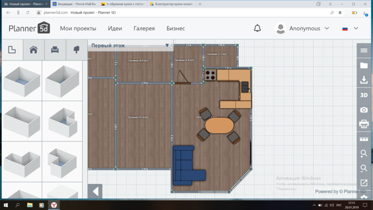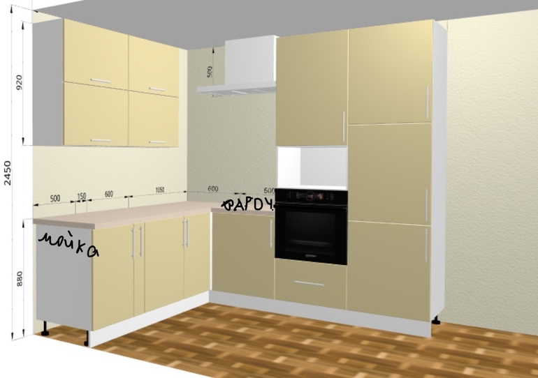 Здравствуйте. Спасибо вам большое. Простите телефон разбился и не могла выйти в интернет. В первом варианте, что за шкафчик посередине? Мне нравится идея расположения холодильника и колонны слева. Спасибо. Наверное кухню сррава сделаю покороче и вместо барной стойки стол обеденный поставлю.