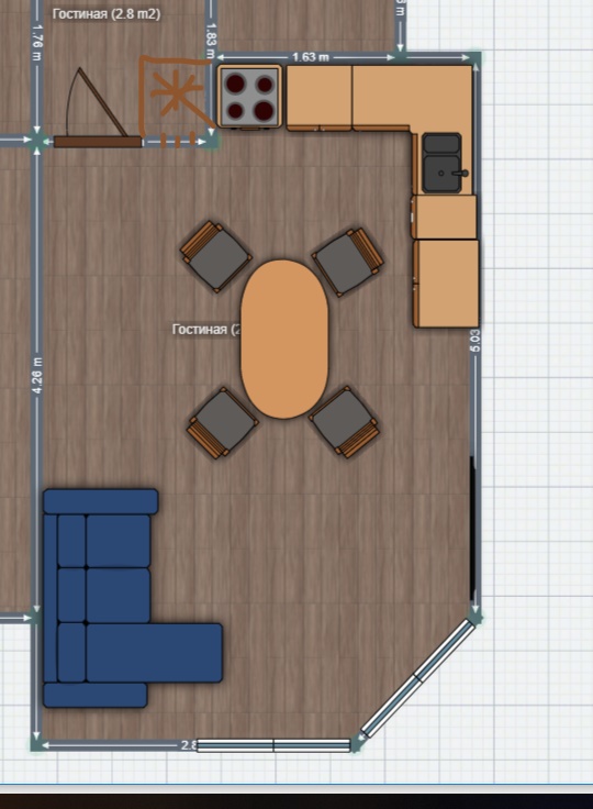 Поняла теперь. Так прикольно смотрится и место экономмично расходуется. Я рисовать не умею в такой программе. Смотрите: если диван поставить на противоположную стену, телек на середину пустой стены, которая самая длинная. А стол немного в центр сдвинуть тогда. Может, стол круглый лучше?