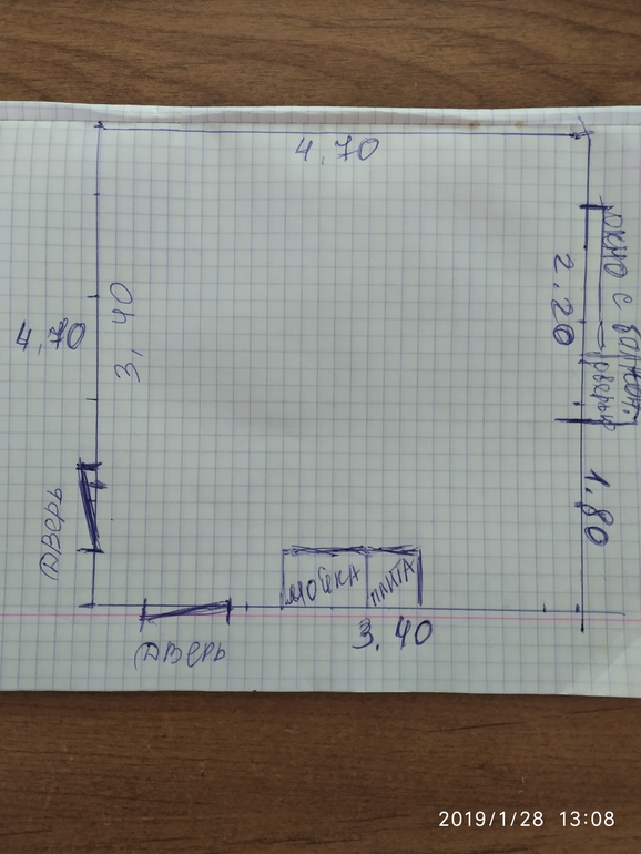 не понятно, нужна ли вам еще какая-то мебель в этой комнате, если нет, то можно просто сделать прямую кухню справа, длина позволяет комфортно разместиться. Стол к окну, диван слева, ТВ я нарисовала в углу, чтобы его видно было со всех точек комнаты, но можно и просто на поворотном кронштейне его установить, допустим, по стене 4.70 в ансамбле какой-то тумбы/витрины, если они нужны.