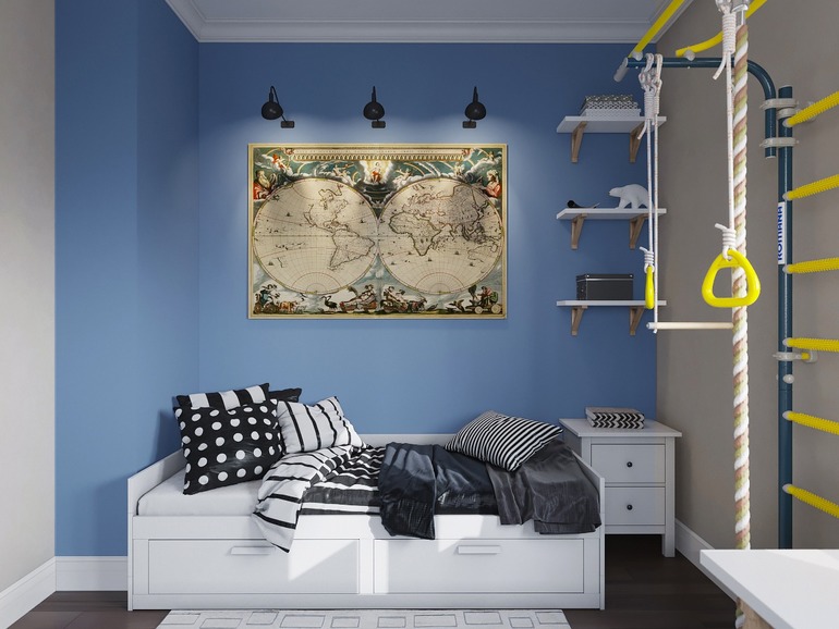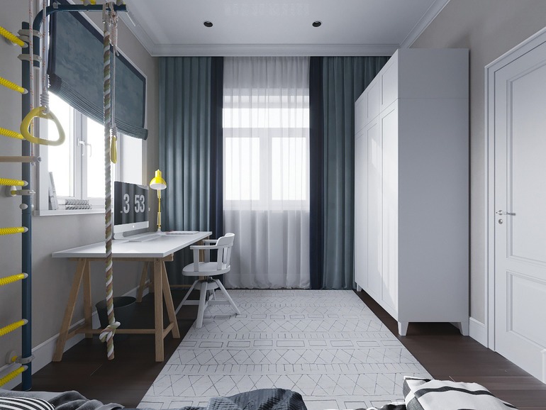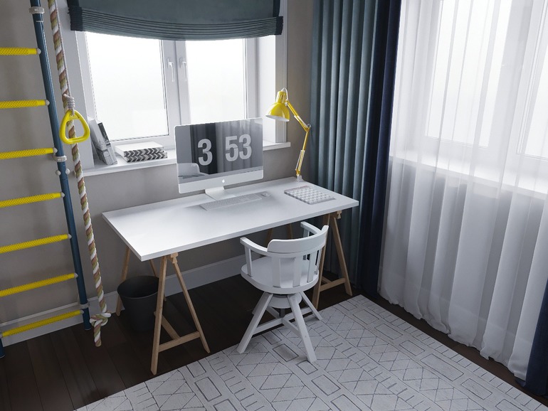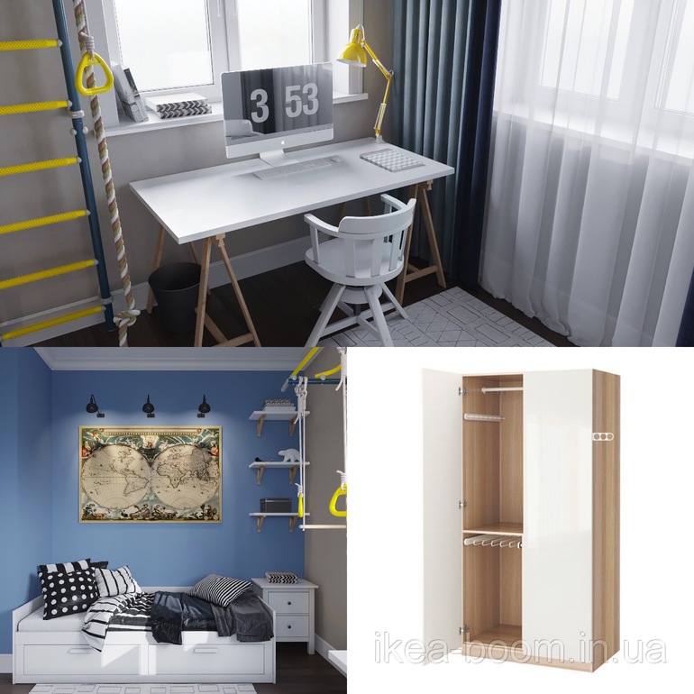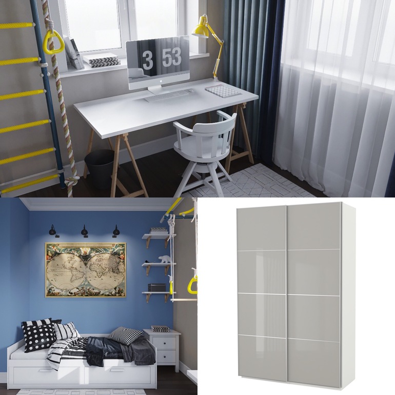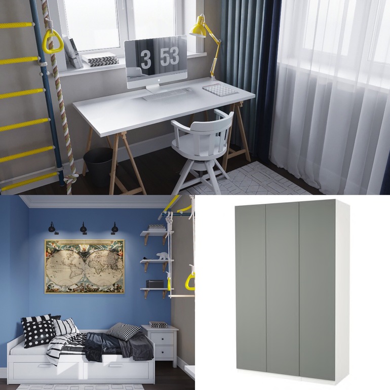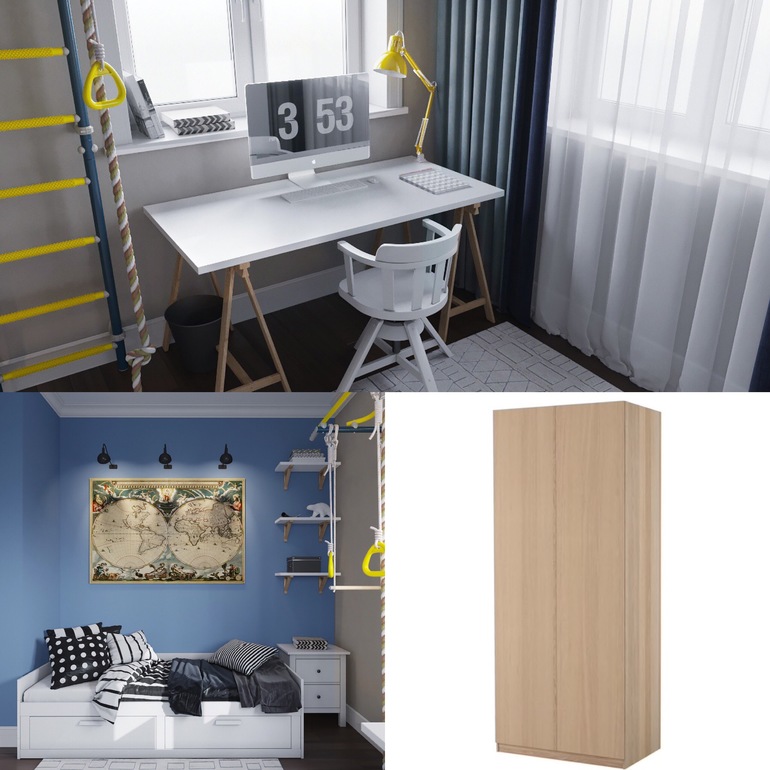 Для меня не важна точность визуализации (стол, полки, тумбочки...). Мы договорились с дизайнером, что размещаем один, а она так же присылает мне алтернатианые варианты мебели. В том числе есть и вариант со столом и стеллажом. Но стеллаж вместо спортивной стенки. Для этого решения я для себя допускаю мысли, что стол будет на заказ, возможно полки рядом с кроватью заменятся на стеллаж (коллакс подходит отлично).