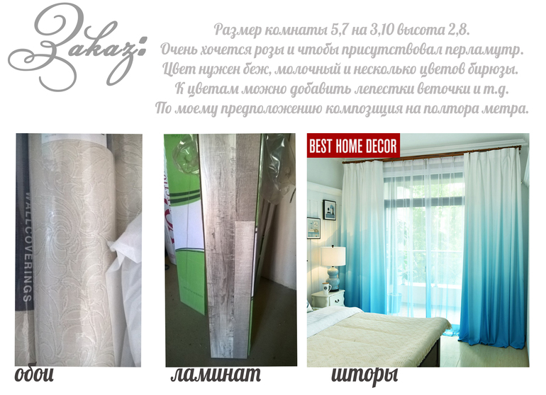 В процессе работы было миллион правок, мы меняли форму, оттенок, вид цветов, двигали и переставляли. Было написано более 90 писем между мной и заказчиком. В итоге, все остались довольны результатом. Ждем окончания ремонта и фото в интерьере.