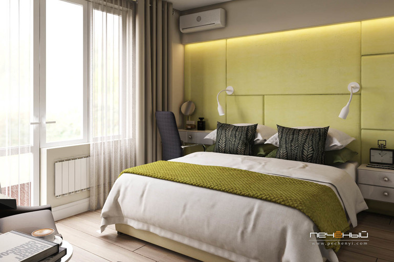 В изголовье - тканевые настенные панели, которые делаются на заказ. В нашем случае они прекрасно вписываются в современный интерьер спальни. У тканевых панелей есть свои преимущества и недостатки, но смотрятся они и правда классно, особенно в нишах с подсветкой. В углу возле окна стоит туалетный столик, который по совместительству ещё и рабочий уголок.