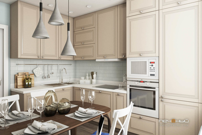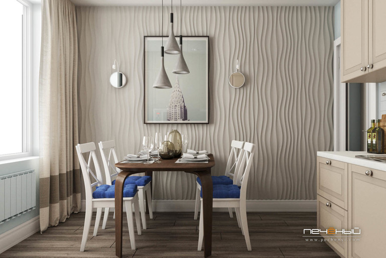 Здесь много от современного стиля, но в кухне, например, есть классические элементы. Почему так? Ответ достаточно простой: дизайн для души важнее любого строгого журнального соответствия с каким бы то ни было стилистическим направлением. Кому-то покажется, что кухня получилась очень громоздкой, и по-своему каждый зритель будет прав, ведь он судит исходя из личных предпочтений. Для заказчиков было важно установить посудомойку, духовой шкаф и отдельную микроволновку - значит, для последних двух пришлось делать «столбик» рядом с холодильником. Хотелось как-то особенно выделить стену возле обеденного стола, поэтому декорировали её 3D-панелями.