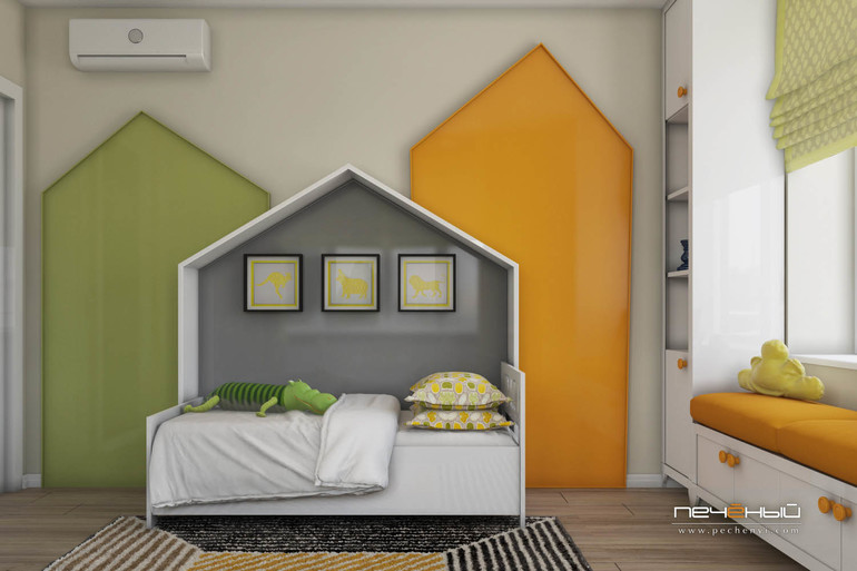 Дешёвый вариант популярной идеи с кроватями-домиками: обычная кровать из IKEA и надстройка сверху в форме домика. Стены украшены панелями, которые делаются на заказ. Получилось просто и со вкусом, интерьер в ярких тонах - то, что нужно для ребёнка.