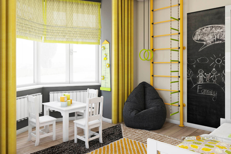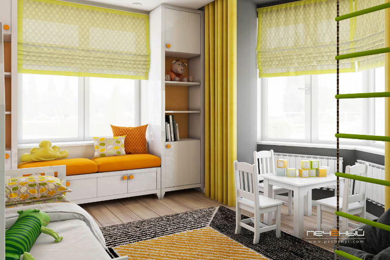 Повезло с планировкой: за счёт эркера в комнате очень много света, целых три окна получается. Когда ребёнок подрастёт, маленький столик заменят на письменный. А пока у малыша идеальная детская для активных игр. :)
