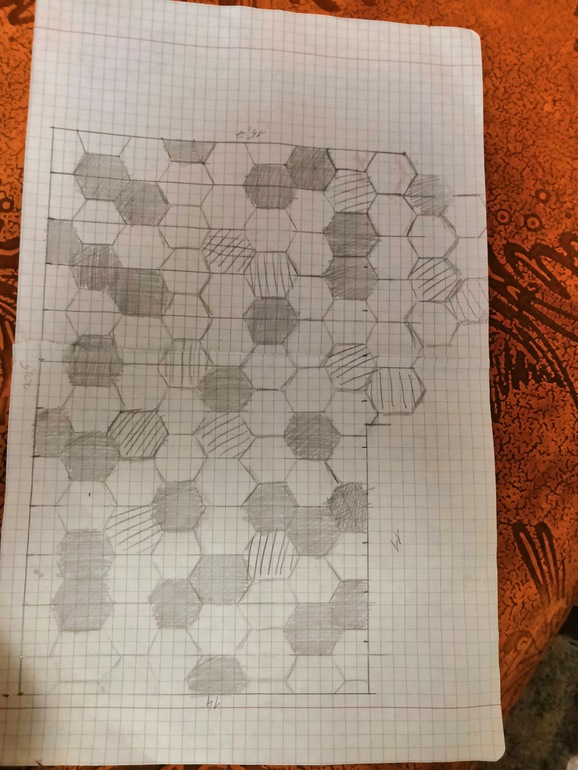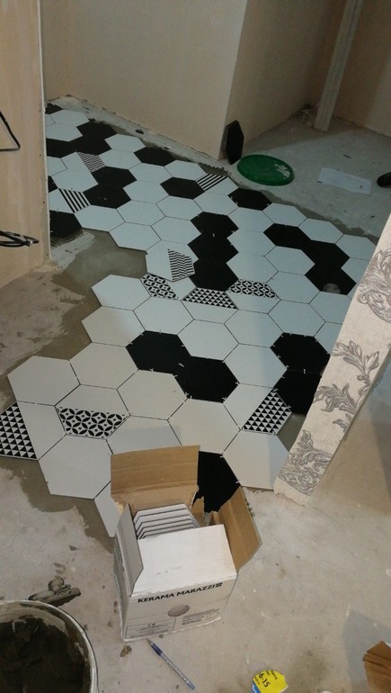 В салоне предлагали сделать, но когда начали...это тихий ужас, то ли программа, то ли дизайнер никак не могла совладать с этой шестигранной плиткой. Сидели 40 минут,!!!!результата 0....В итоге мы просто всё пространство заделали белой, чтобы тупо посчитать количество плиток, потом прикинули сколько надо из этих чёрных, чтобы не затемнить и добавили немного рисунка, получили количество которое нам надо, а я уже дома делала раскладку вот так