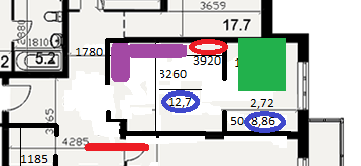 Фиолетовым - предполагали поставить диван. Зеленым - наша кровать. Напротив дивана телевизор и стенка будет или что то для телевизора в современном стиле. Идея вот такая.