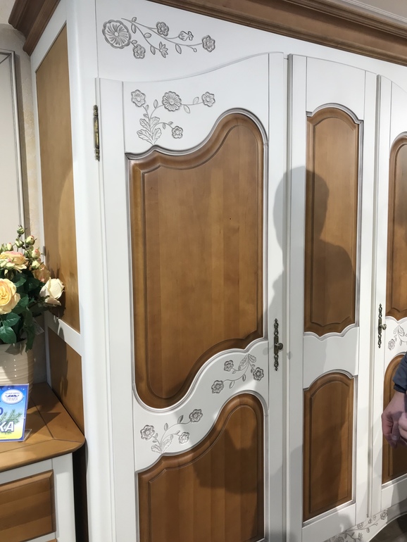 у старшей моей итальянская. дерево, вроде. там даже листики встроены в шкаф настоящие).
