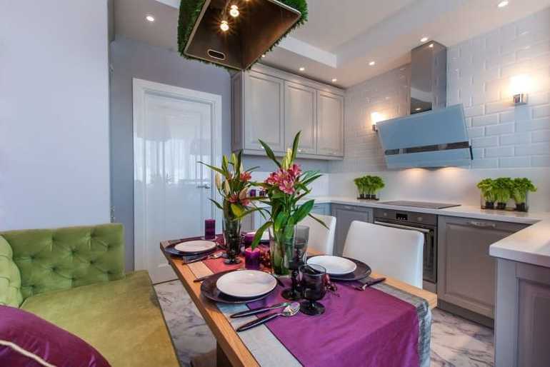 На 6 кв метрах вы еще и диванчик, и стол, и два стула хотите. А что из этого гарнитура поместится? Или я что то не поняла? Обои на такой маленькой площади обязательно однотонные, можно фактурные. Я бы к серой кухне желтые стены сделала. Серый с желтым сочетается. И в общем теплая комната получится. Краска тоже хорошо, но мне с окрашенными стенами не уютно. Диванчик синий сложный или бирюзовый или цвета фуксии. Это если яркости хочется. А можно монохром. Ниже вам красивые обои предлагали. Разбавите яркими акцентами.