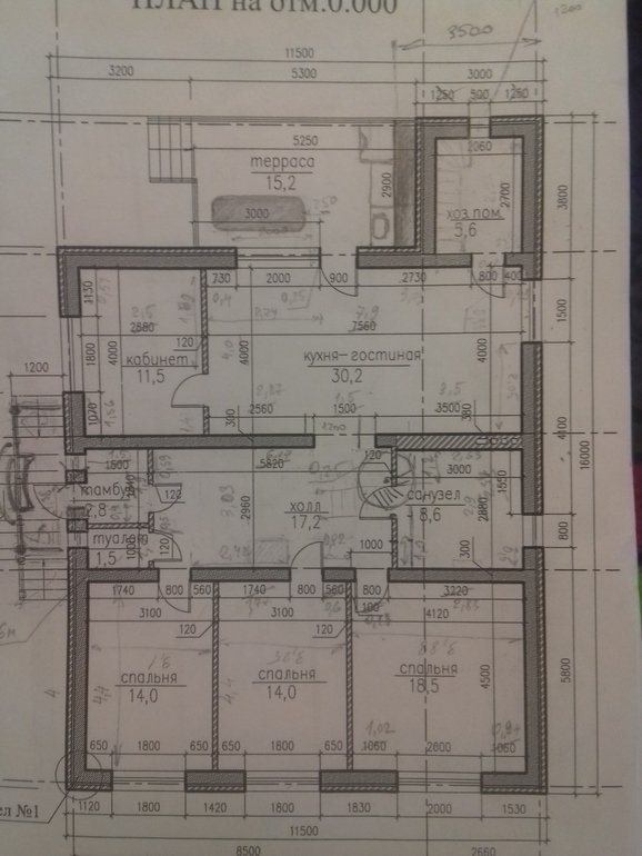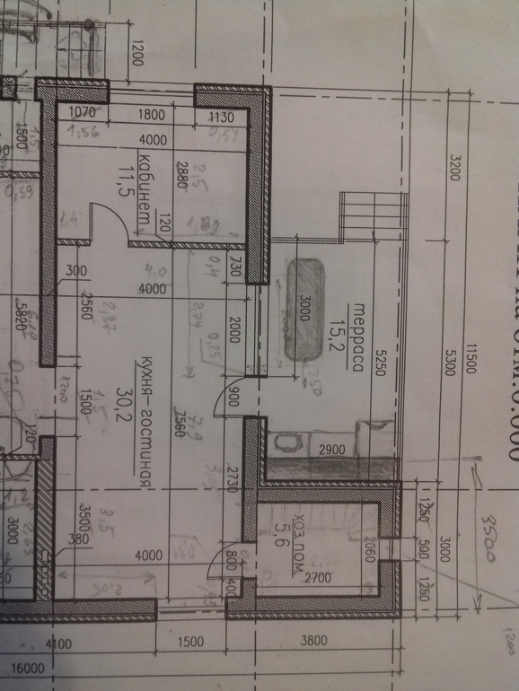 Точные размеры написаны карандашом. И дверь, которая ведет в кухню-зал будет смещена влево на 0,52 м. Чтобы сделать угол под винтовую лестницу на мансарду. То есть стена под кухню будет 4 м 20 см.