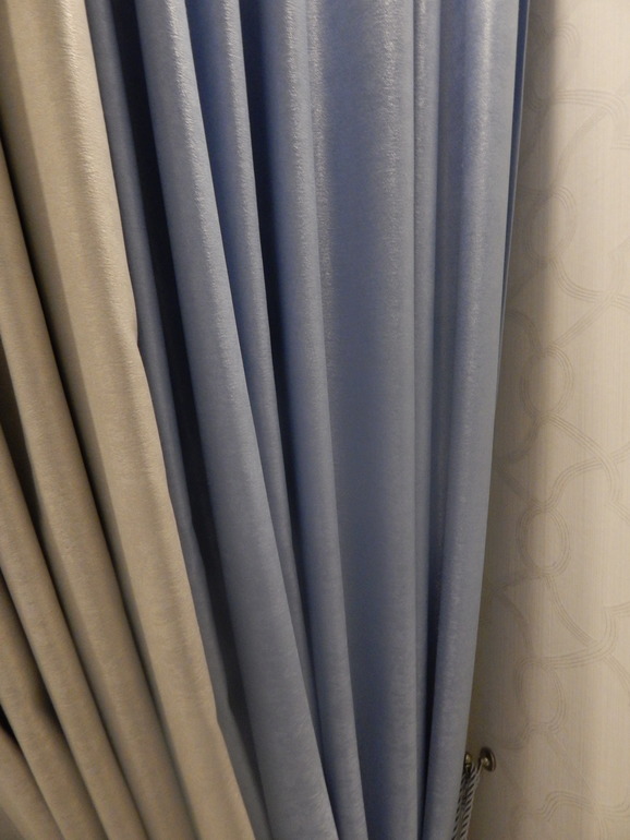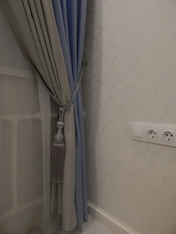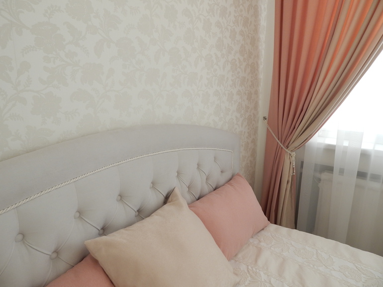 Очень жалею, что не заложили нишу под шторы. Эти настенные круглые карнизы для меня крайне неудобны, к тому же предательски провисают((( Это уже второй, и тоже провис, хотя шторы из легкой портьерной ткани. Шторы и подушки из одной и той же двухсторонней ткани. Здесь более-менее цвет, приближенный к реальности:
