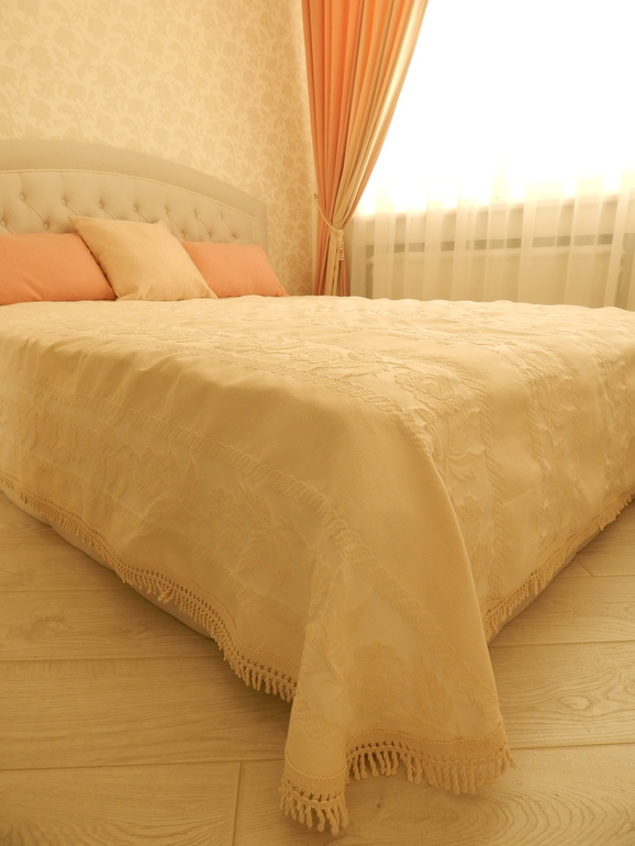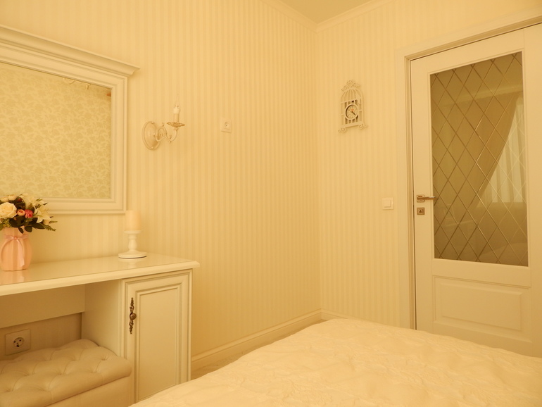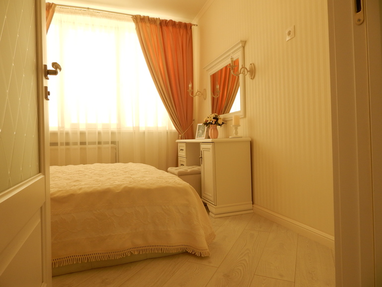 Спальня очень маленькая, около 9кв.м. Чтобы зрительно хоть как-то расширить пространство, использовала все те же приемы, как и в других комнатах: белый потолок, белая, дверь;светлые обои, мебель и пол, выложенный по диагонали. Фотки почему-то
