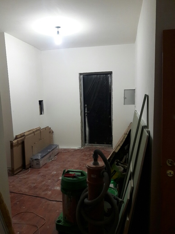По правую руку от двери угол широкий, именно туда просится банкетка-галошница-зеркало-все что хотите. И второй лючок можно будет зеркалом закрыть, например