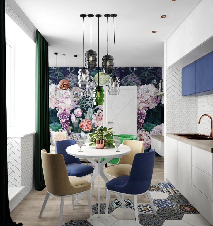 Заказчики, пришедшие к нам по "сарафанному радио", оказались тоже людьми творческими и очень смелыми. Мы смогли осуществить несколько наших давнишних мечт, как то - интерьер с ОГРОМНЫМИ цветами на стене гостиной. Или безумное и прекрасное сочетание глубокого синего, зеленого и красно-бордового в одном интерьере. Восторг да и только!