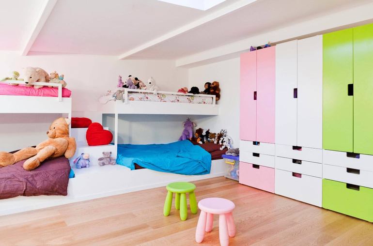 У детей в комнате по шкафу на каждого. То есть у старшего шкаф, у младшего пока что комод. Все вещи из которых выросли - лежат у нас на шкафу. У нас в коридоре нет места для шкафа, так что в детской комнате - детские вещи.