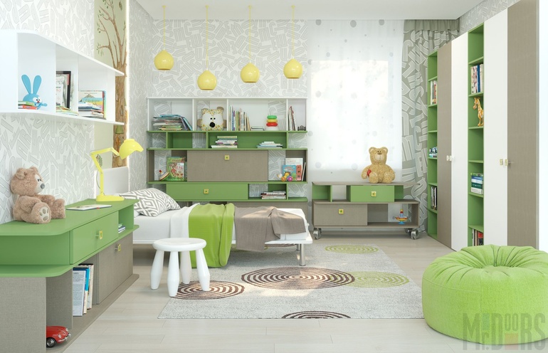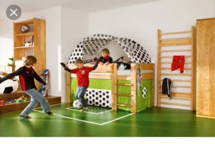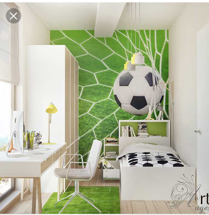 Мне сразу представилась комната в футбольном стиле )) я бы на вашем месте приобрела бы исключительно белую мебель, либо деревянную мебель, кинула бы ковер "Аля футбольное поле" и кресло грушу, люстру в виде футбольных мячей и зелёные римские шторы.