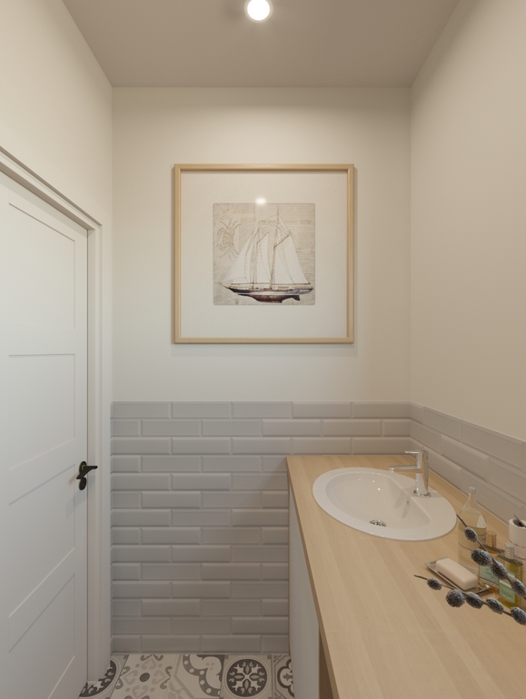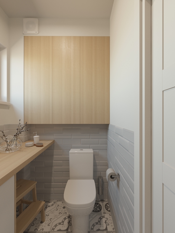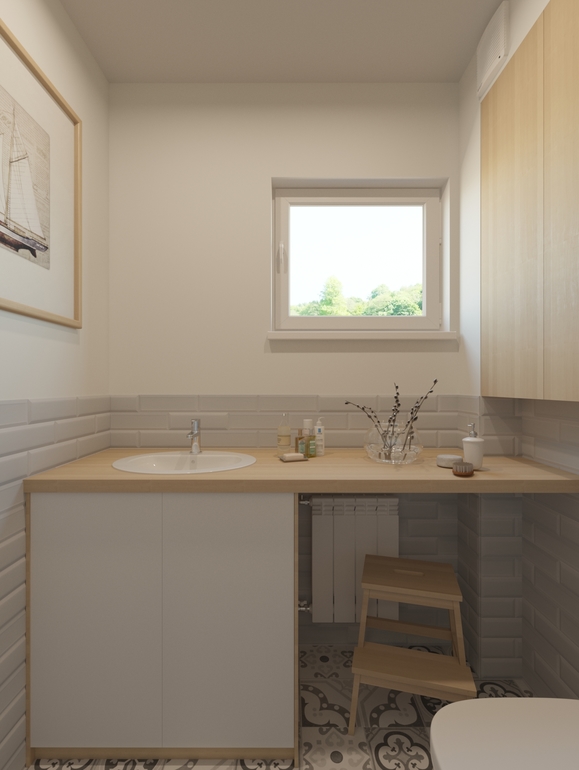 Санузел на первом этаже. Под раковиной корзины для белья.