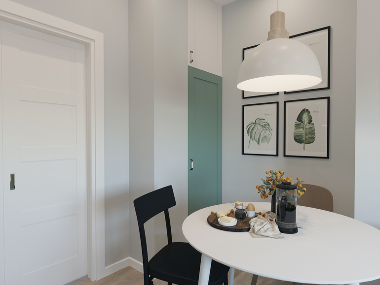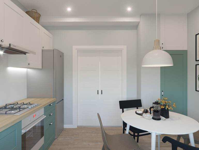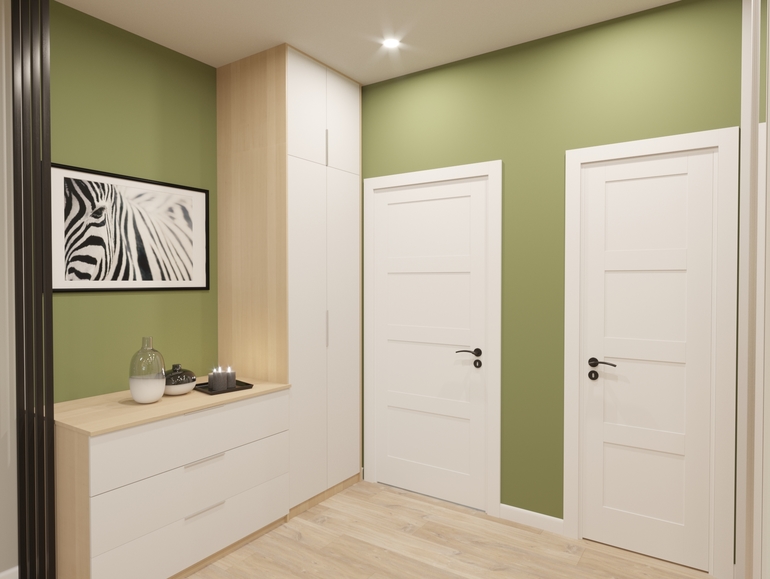 Большие белые двери - это в гостиную. А зелёная дверь справа - это шкаф для заготовок. Я люблю и делаю много.