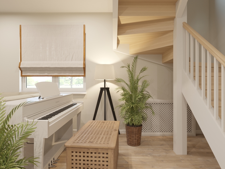 Стул у инструмента тоже под вопросом пока. Мне нравится вариант с сундуком (чтобы складывать в него игрушки, которые наверняка будут на первом этаже), но сундук смотрится немного громоздко, поэтому пока не уверены, возможно подберем что-то более компактное.