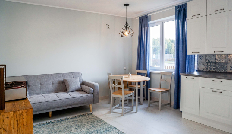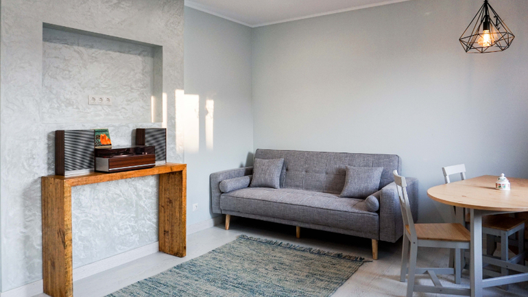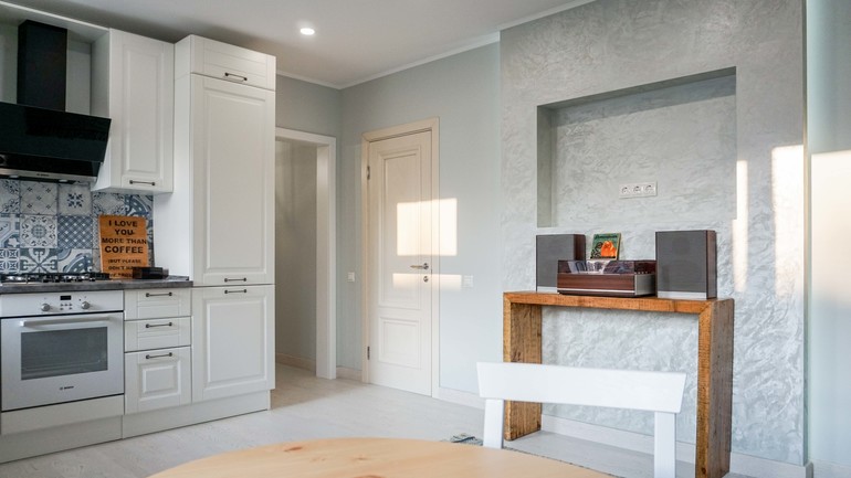 А теперь поподробнее! Начнем с первого этажа, а именно с кухни-гостиной. Кому-то покажется странным, что телевизор расположен не напротив дивана, но заказчики смотрят его редко, поэтому не хотели делать его центральным элементом помещения. В случае кино-просмотров телевизор на кронштейне можно будет поворачивать в сторону дивана. Под телевизором встала деревянная консоль, на которой будет стоять проигрыватель для коллекции пластинок заказчиков. Для цвета стен был подобран светло-серый воздушный оттенок, а в качестве акцентов использовался приглушенно-голубой цвет.