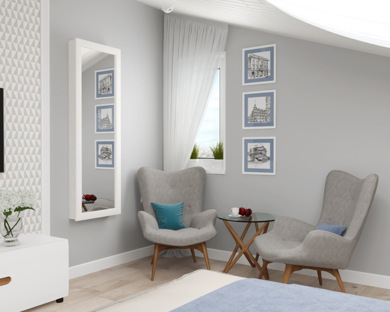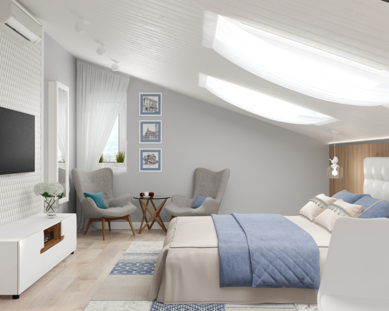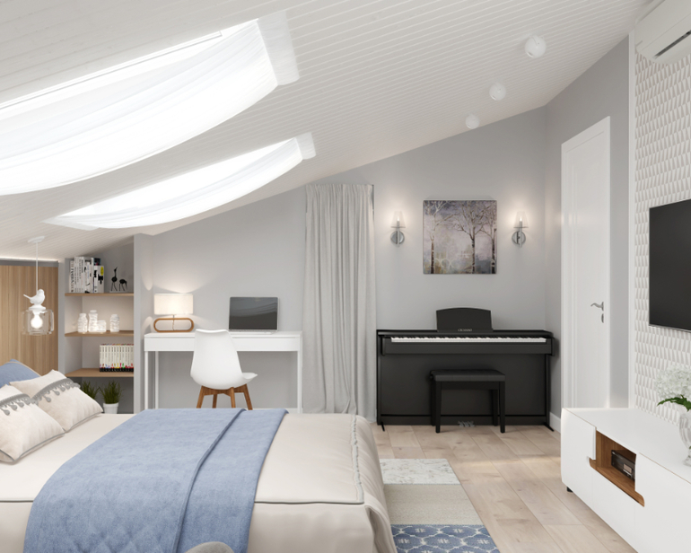 И наконец переходим к мансарде! Уединенный уголок для молодых родителей. Тут есть и широкая кровать, и рабочее место, и уголок для релакса с комфортными креслами, и вместительная гардеробная, даже музыкальная зона с пианино. Цветовое решение все тоже: спокойная гармония серых и голубых оттенков.