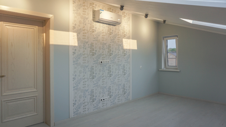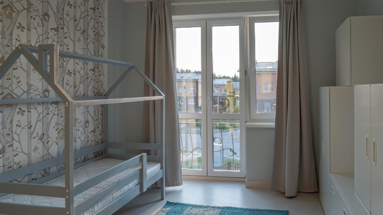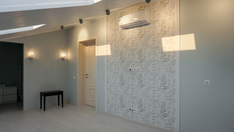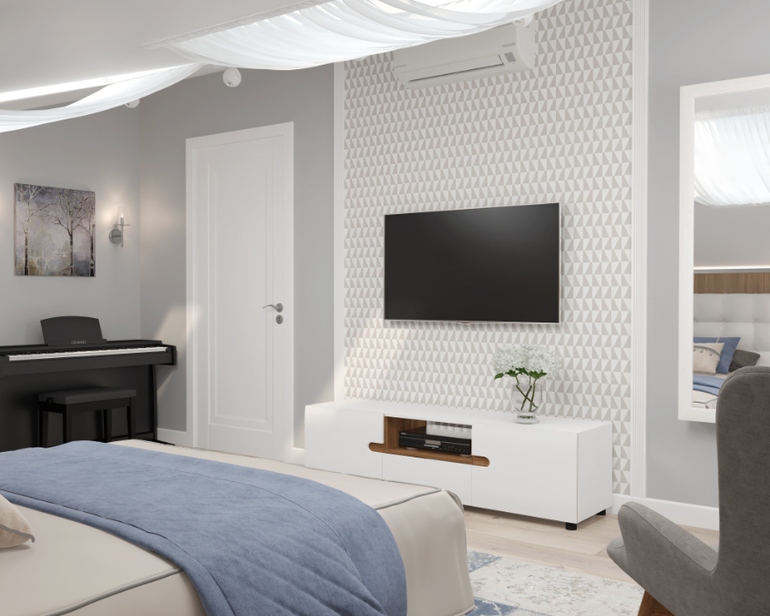 Поскольку заказчики пока временно будут жить на втором этаже с детьми, это помещение еще не обставлено. При ремонте в проект внесли небольшие изменения, например стену за изголовьем кровати выкрасили в тон остальных стен, а обои за ТВ заменили (артикул на визуализациях сняли с производства). Штору в проем мансарды пока не повесили, пианино еще не приехало (на фото только табурет для него).