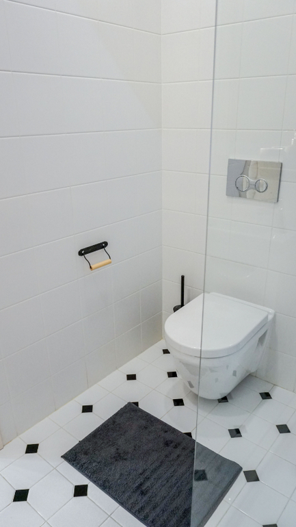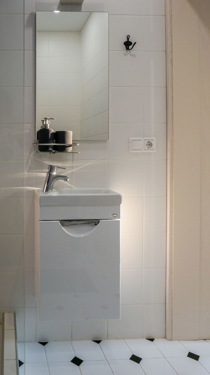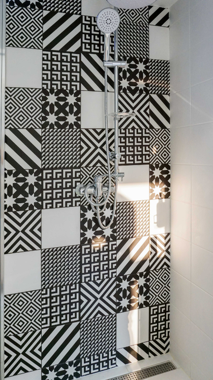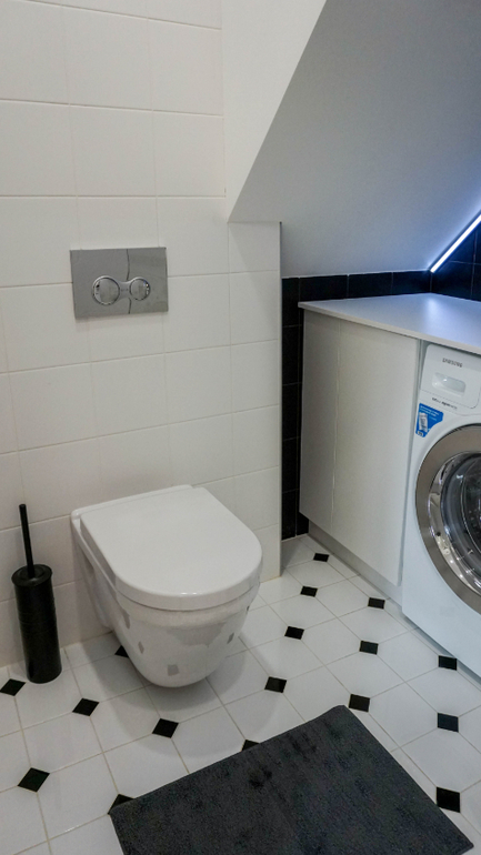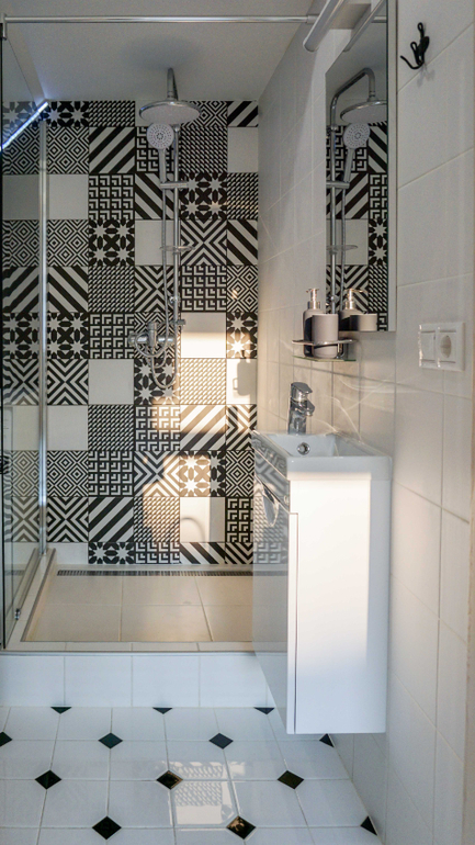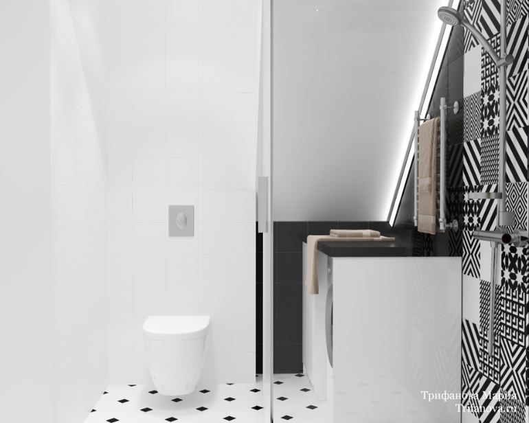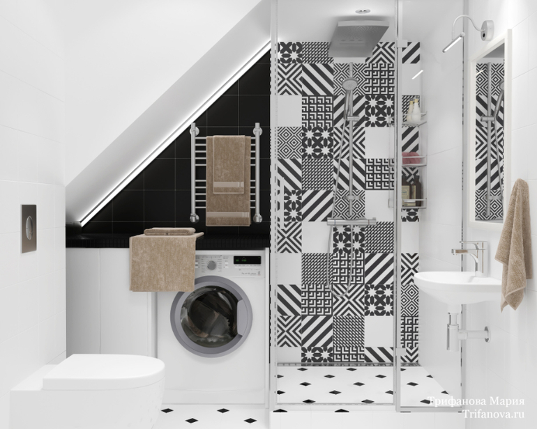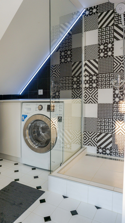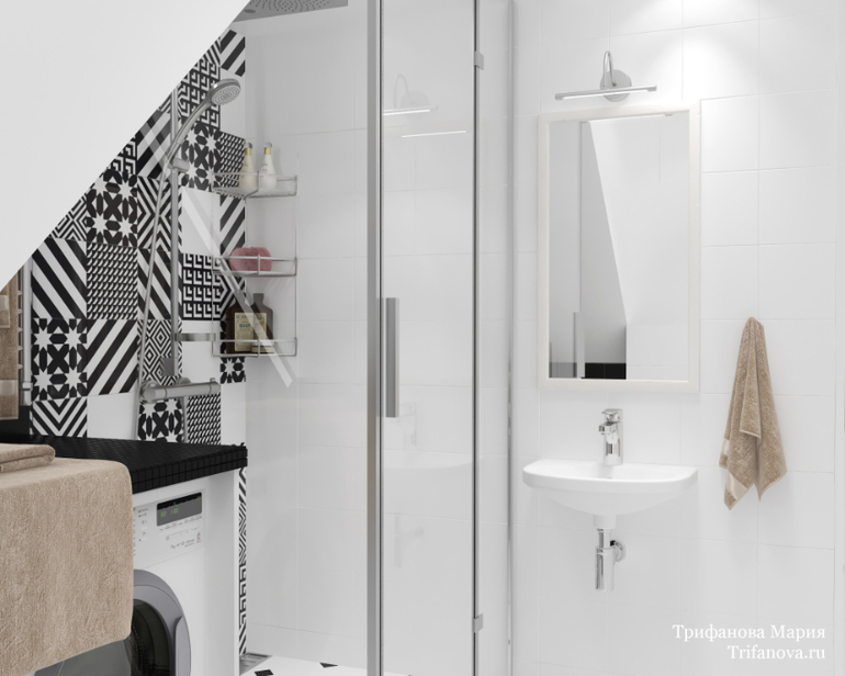 Через дверь на фото можно попасть в небольшой санузел с душевой, который расположился под лестницей. Для него была выбрана смелая черно-белая гамма и плитка с активным орнаментом. Основной цвет - белый. Он визуально позволяет сгладить многочисленные углы помещения.
