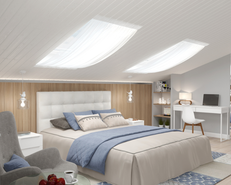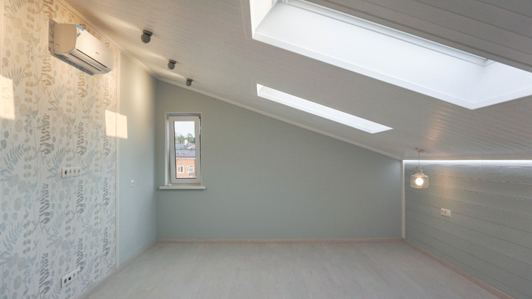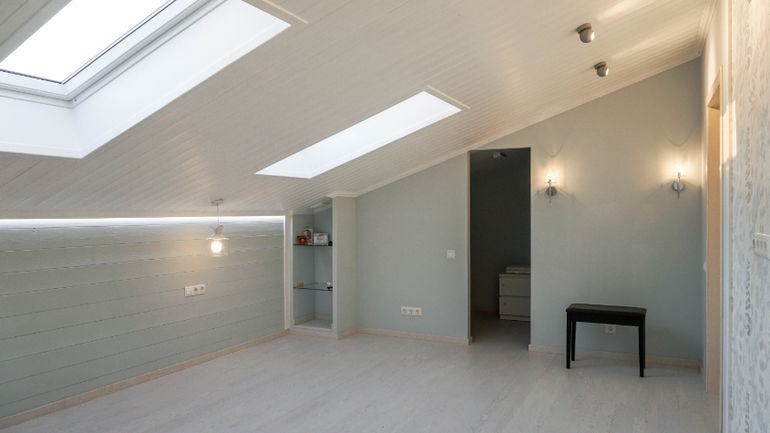 Когда начинали работу, на третьем этаже не было мансардных окон, было только маленькое окошко в торце комнаты. Дневной свет значительно расширил границы помещения и абсолютно изменил восприятие этого пространства.