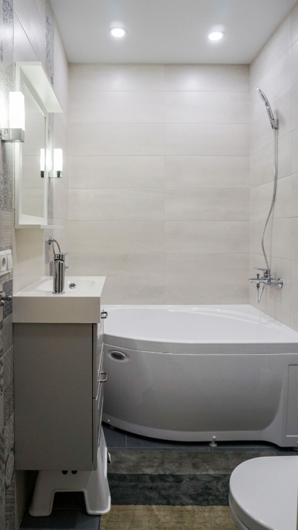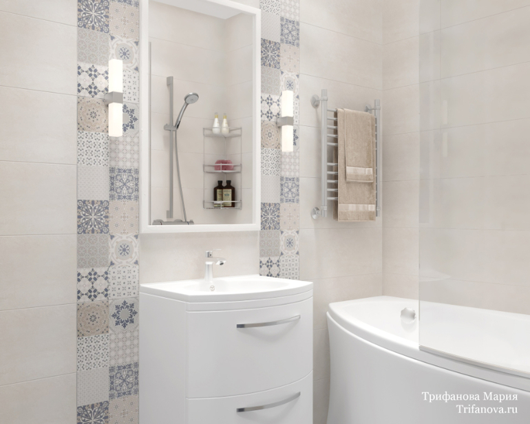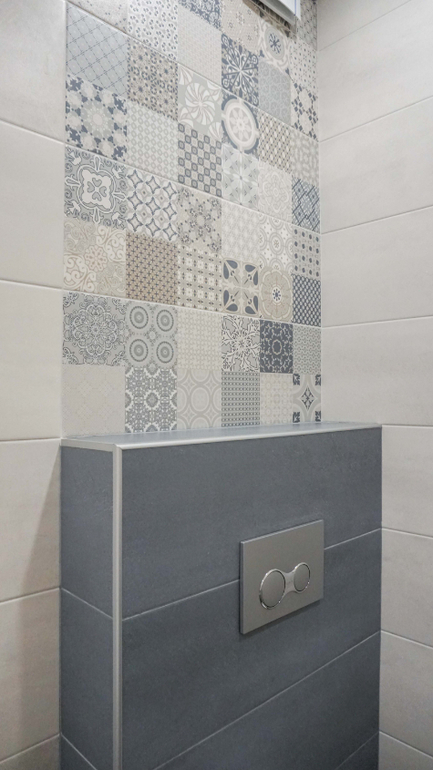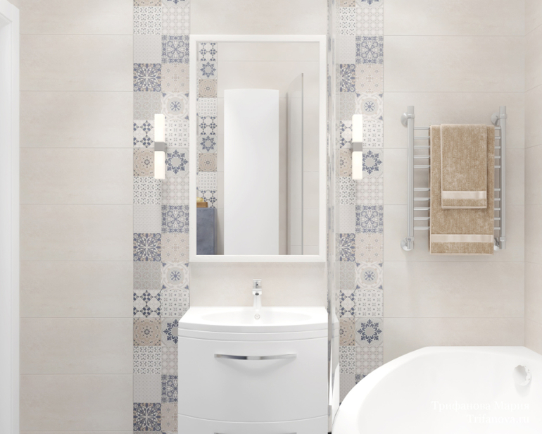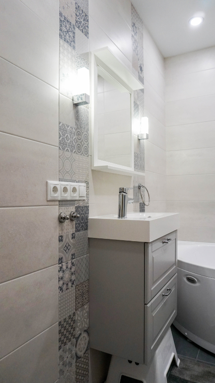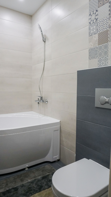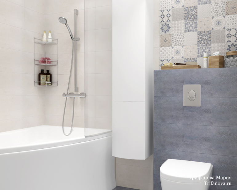 Санузел для детей все в той же серо-голубой гамме. Коллекция плитки в санузле чем-то похожа на коллекцию на фартуке кухни. Размеры санузла очень скромные, но тем не менее удалось разместить все необходимое.