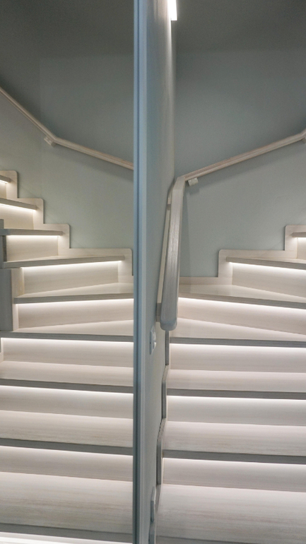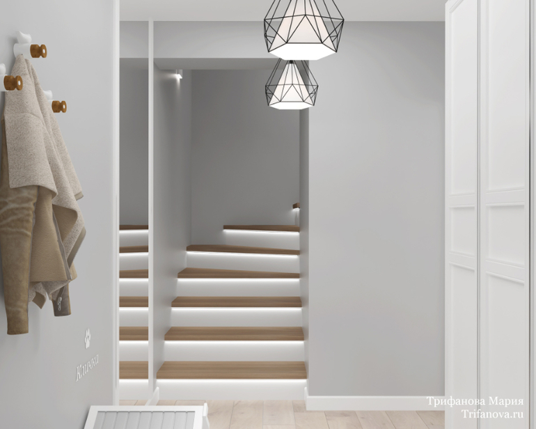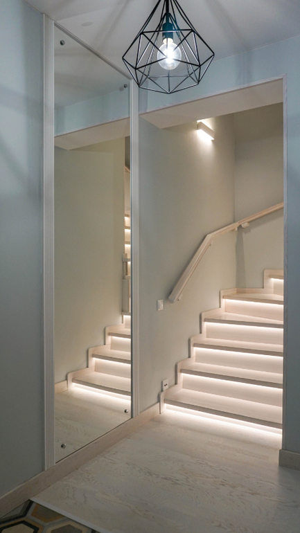 Мебель для прихожей еще не приехала на момент фото, но зато мы сфотографировали напольную плитку и лестницу с космической подсветкой! Подсветка ступеней включается не одновременно, а мягко, по одной ступеньке убегая ввысь! В видео в начале статьи можно посмотреть этот эффект. Кроме того, работает подсветка от датчика движения, что очень удобно, никакой мороки с выключателями.
