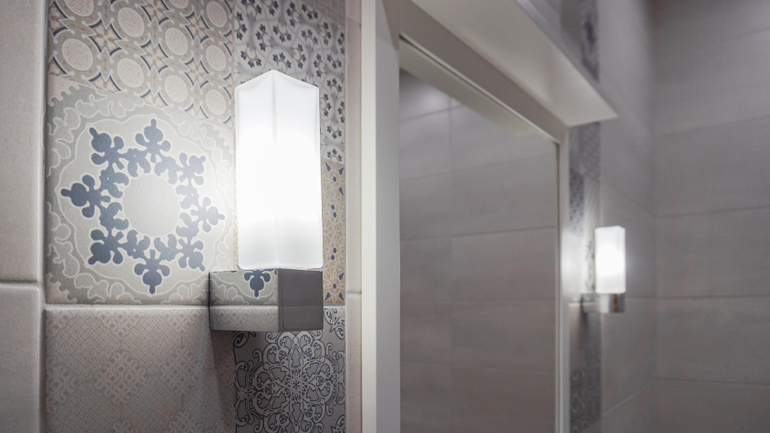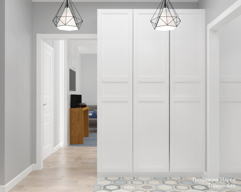 Из кухни-гостиной мы попадаем в прихожую. Плитка с шестигранниками на полу удачно перекликается со светильниками такой же формы.