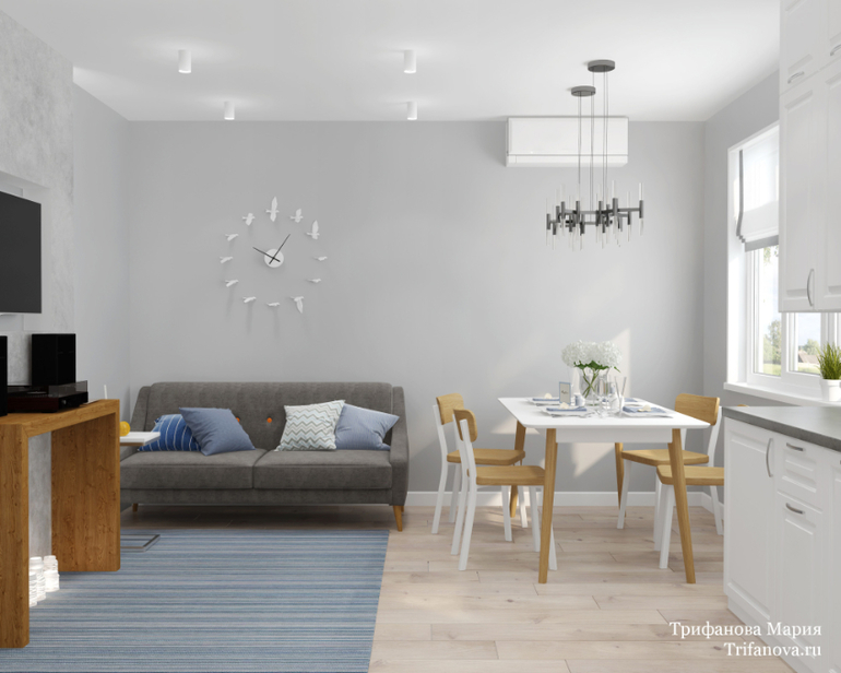 Реализованный проект. В гостях мы побывали незадолго до переезда, так что еще не вся мебель и элементы декора были на местах. На визуализациях стены были чисто-серого цвета, но при реализации заказчики выбрали серый с легким голубым оттенком, что сделало атмосферу помещения еще более воздушной.