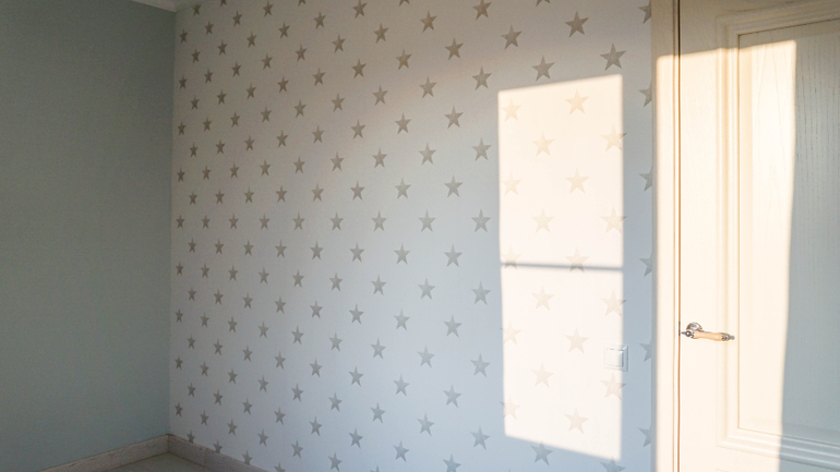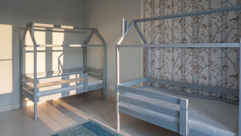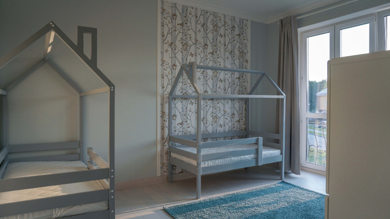 Пока детишки еще маленькие заказчики решили их поселить в одной комнате. В соседней временно будут спать сами. Когда дети достаточно подрастут, все переедут по своим комнатам, как и планировалось изначально. По этому на фотографиях две кровати стоят в одной комнате, а вторая пока пустует. На момент ремонта панно с птичками к сожалению сняли с производства, по этому вместо него поклеили обои с похожим рисунком из той же коллекции.