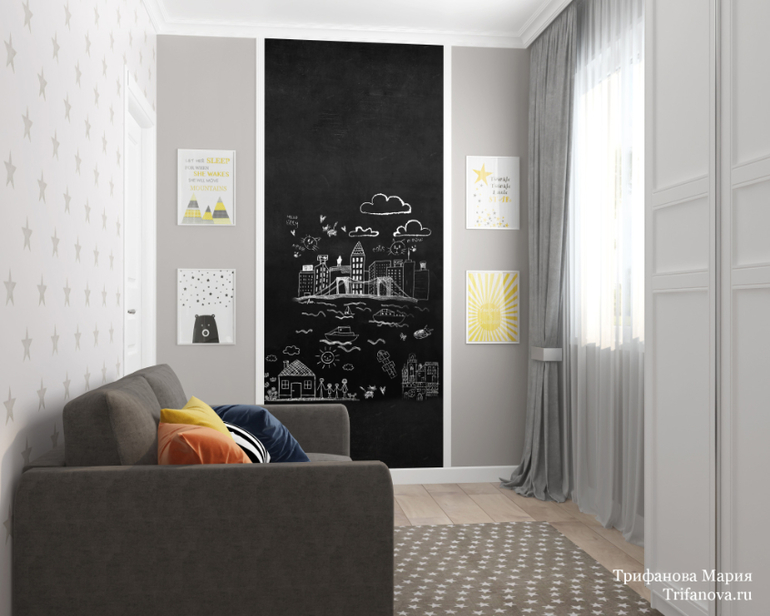 В детской мальчика те же желтые акценты, но по другому обыгранные.