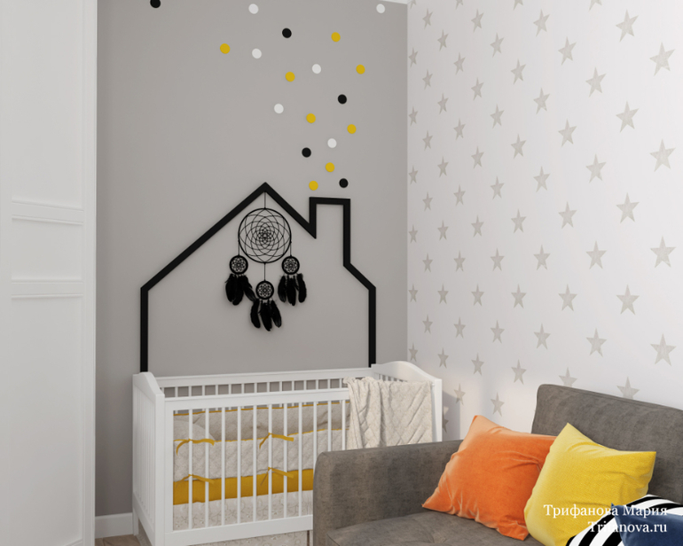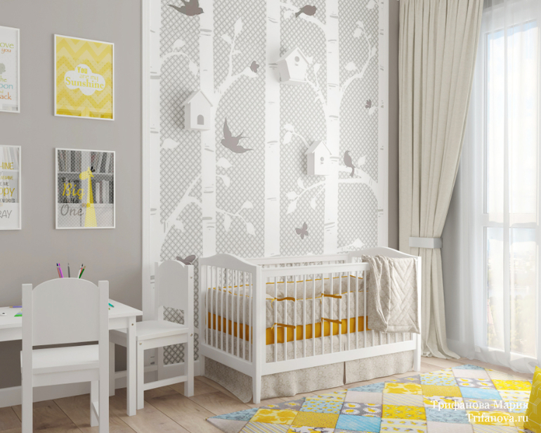 На втором этаже две детские для двойняшек, мальчика и девочки. Основной цвет стен также серый, как и на первом этаже, но веселые желтые акценты добавляют нужной атмосферы. Детскую дочки украшает панно с птичками.