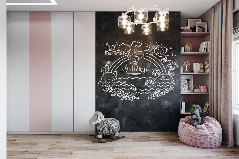 Ну и грифельная черная доска. Мел с нее сильно сыпется, если рисовать на ней (если это не просто декоративная черная стенка с рисунком). Все это будет на полу и будет разноситься по всей квартире. Надо делать какую-то подставку/ступеньку, чтобы можно было это все вытирать и заодно, чтобы было куда складывать мел. И я бы сделала ее магнитной! Хотя не знаю ,бывают ли такие большие магнитные доски. Чтобы вешать детские рисунки, расписание уроков, просто красивые картинки.