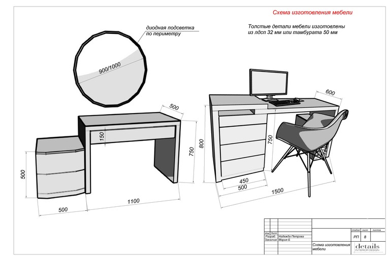 У окна установили удобный письменный стол, который можно при желании "собрать" и освободить пространство вокруг. Стол сдвигается к тумбе. Особым пожеланием было сделать дамский столик с яркой подсветкой, стол сделали и поставили большое уютное гримерное кресло.