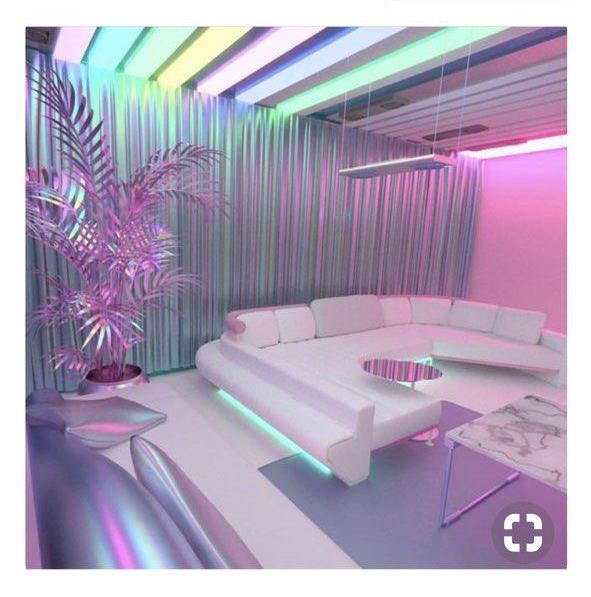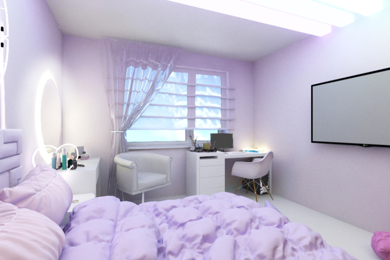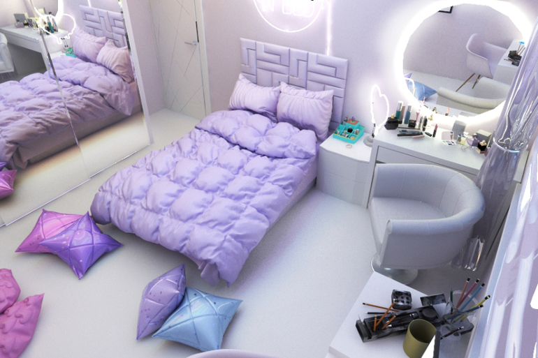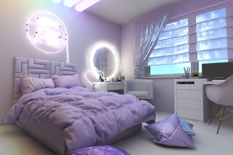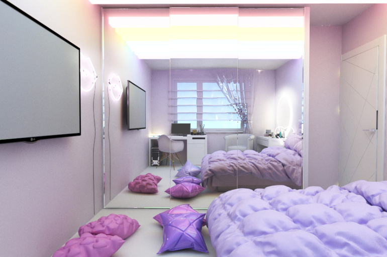 Важным атрибутом комнаты стал неоновый свет - неоновые подсветки на стенах, настольная неоновая лампа, неоновая подсветка для зеркала, неоновые светильники на потолке, которые играют разными цветами.