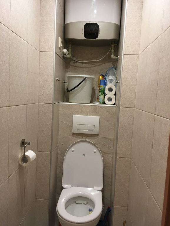 Здесь без выкрутасов. Туалет самый обычный, навесной. Единственное, бойлер поставили. Так что теперь летнее отключение горячей воды не боимся:)😎😎😎