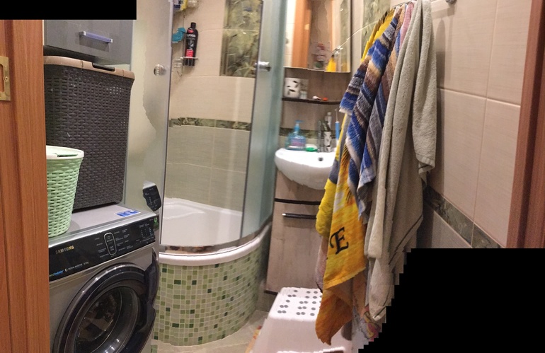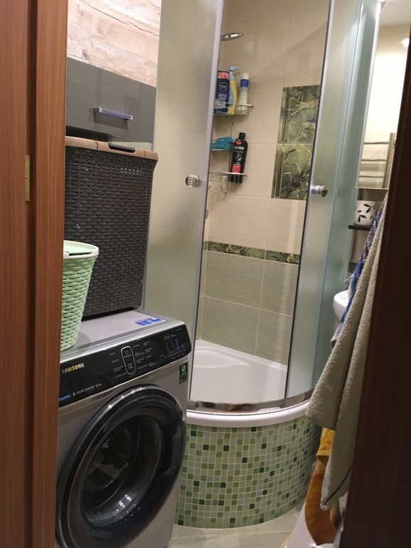 Супруг категорически отказался объединять санузел, но решено было ставить душевую кабину, чтобы влезла новая стиральная машинка , с фронтальной загрузкой ( до ремонта стиралка располагалась на кухне, с вертикальной загрузкой, теперь она выполняет функцию рабочей поверхности, временно, до ремонта кухни) .