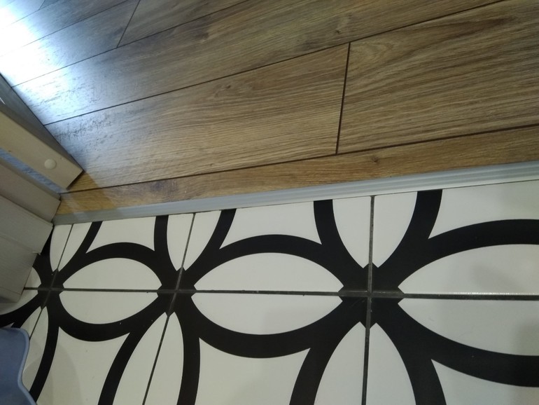 Вопросы и ответыДевочки, покажите, пожалуйста, как правильно нужно сделать стык плитки санузла и ламината в коридоре под дверью.