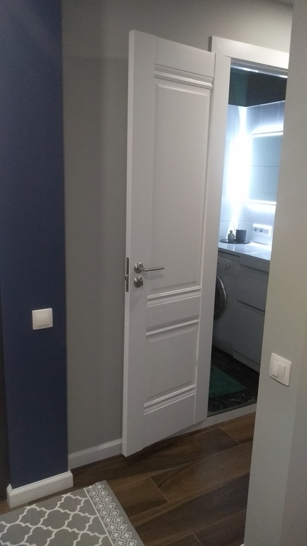 Рекомендую перед укладкой плитки определиться с тем, какая будет дверь. Мы прямо в салоне измеряли все, чтобы понять, где именно будет проходить дверное полотно. Оказалось, что вовсе не посередине дверного проема и совсем не в том месте, в котором мы бы сделали по наитию.