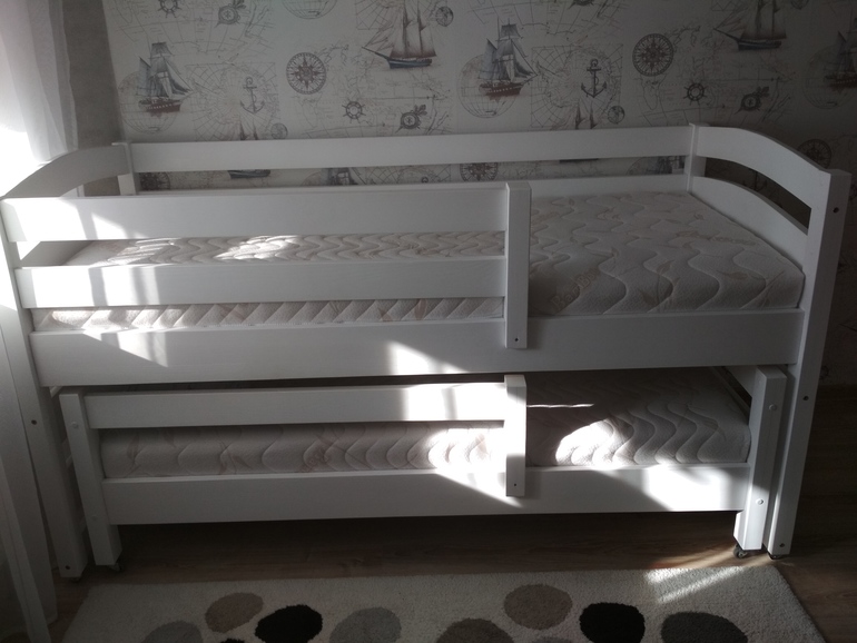 Нижняя кровать на поворотных колесах,можно и в другую комнату выкатить))Верхний матрас на высоте где то 90 см,старший легко залазит.