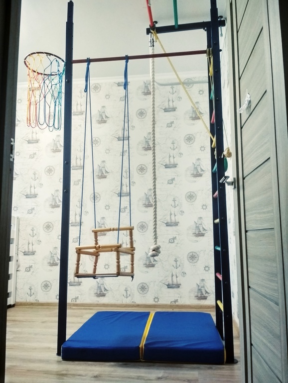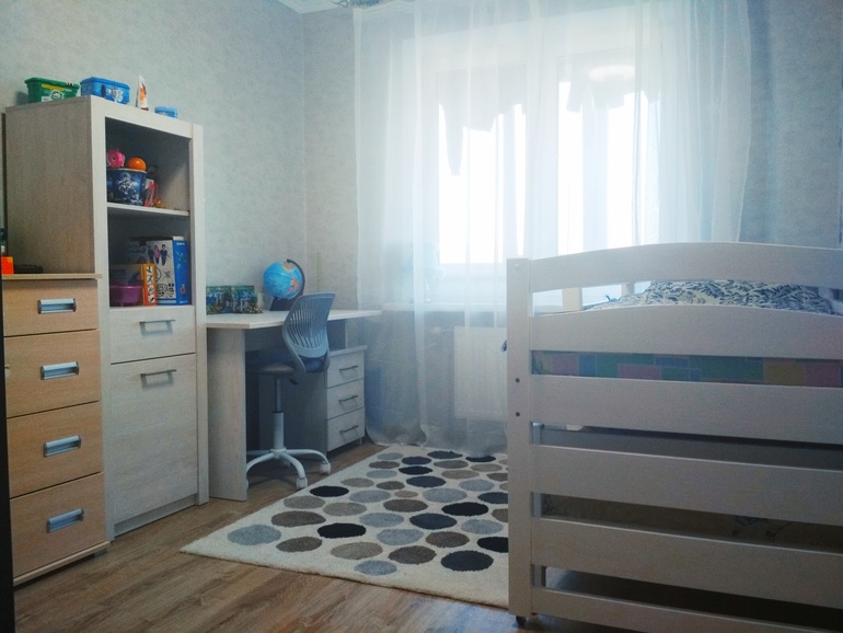 Спасибо) у Вас смотрю учебный стол и тумба рядом не белые, а тоже какого то цвета дерева дсп.сочетается хорошо) у нас примерно такая же комната. Но как заходишь, где у вас спорт комплекс -встроенный шкаф вокруг дверного проема. У нас есть турник (2 позиции), его повешали у нас в спальне пока что. Пока актуален)