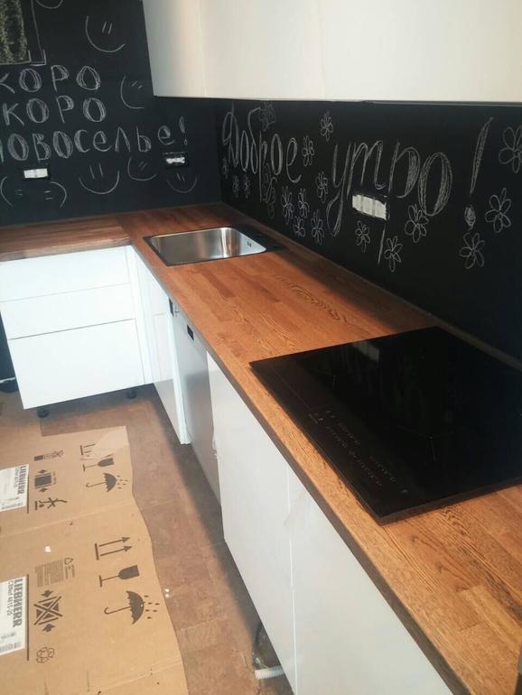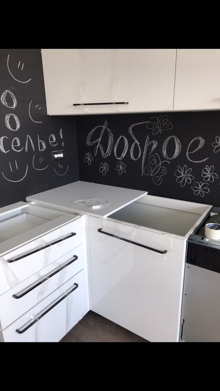 Кухня белый глянец, пока под пленкой. Позже установили столешку, вот так выглядит: